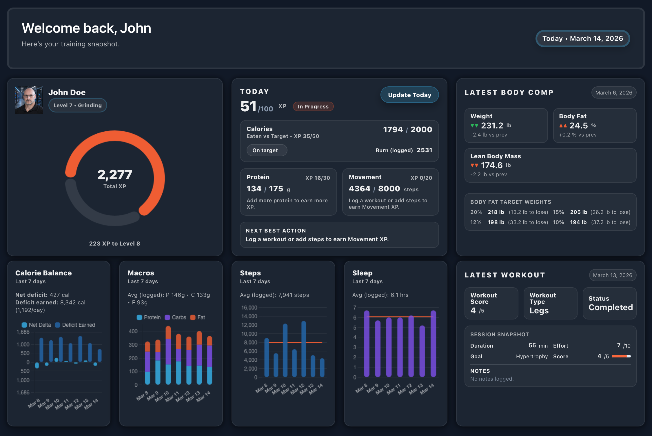 FMF helps you see how calories, macros, steps, and sleep are trending across the week, so you can spot what is improving, what is slipping, and where small adjustments will have the biggest payoff.