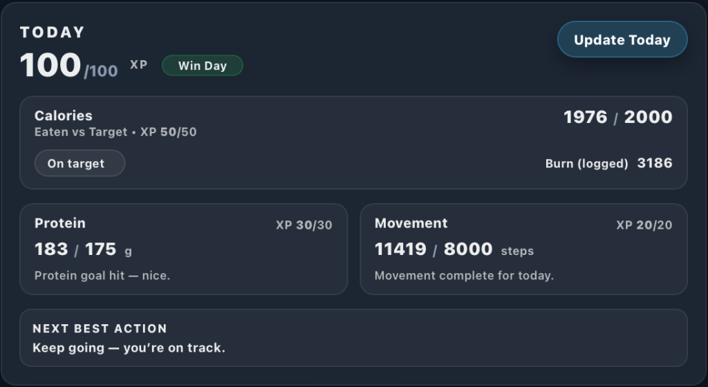 FMF replaces scattered tracking with a single dashboard that tells you where you stand today, what matters next, and how you’re trending week to week.
